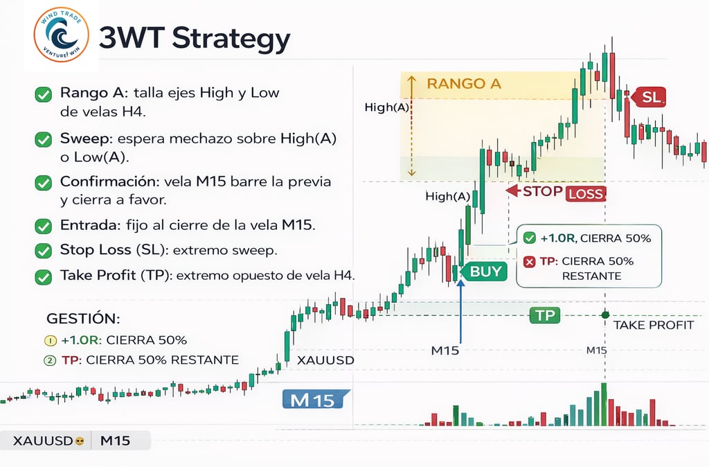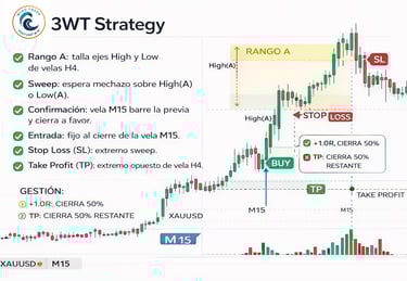 Esta estrategia usa como “escenario” una vela H4: toma su máximo y mínimo como rango. Espera un barrido (sweep) fuera del rango y lo filtra si es demasiado grande. Luego busca confirmación tipo Turtle Soup (TS) en M15 (mecha barriendo la vela previa y cierre con cuerpo a favor) y entra al cierre. El SL queda en el extremo del sweep y el TP en el otro extremo del H4.